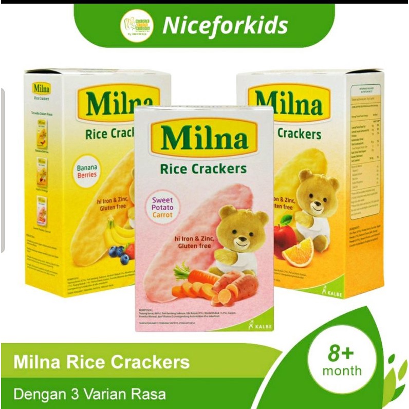 Milna Rice Crackers merupakan camilan yang terbuat dari beras sebagai sumber energi, serat, vitamin dan mineral dengan bentuk yang mudah digenggam dan lumer sehingga tidak membuat bayi tersedak.