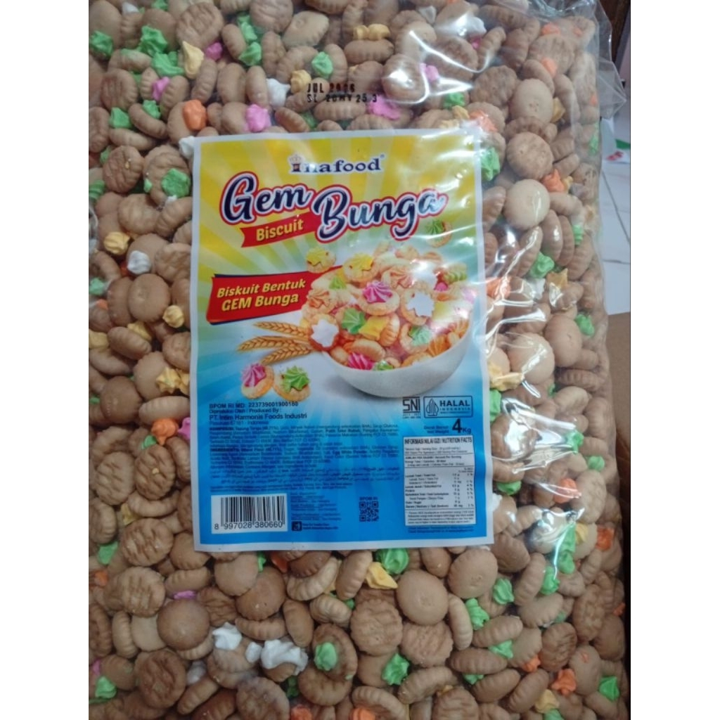 Biskuit bunga gem biskuit dengan bentuk bulat dengan topping gula berbentuk bunga yang manis krenyes. Biskuit bunga gem adalah cemilan jadul yang legendaris masih banyak diminati. Biskuit bunga g dapat dinikmati saat santai dan juga buat bekal atau bingkisan