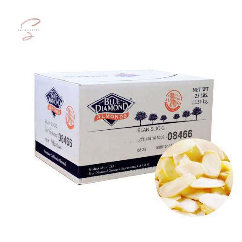 Almond Slice Blue Diamond / kacang almond berbentuk iris tanpa kulit. Blue Diamond menggunakan teknologi yang tinggi membuat tekstur menjadi lebih renyah dan rasa yang gurih.