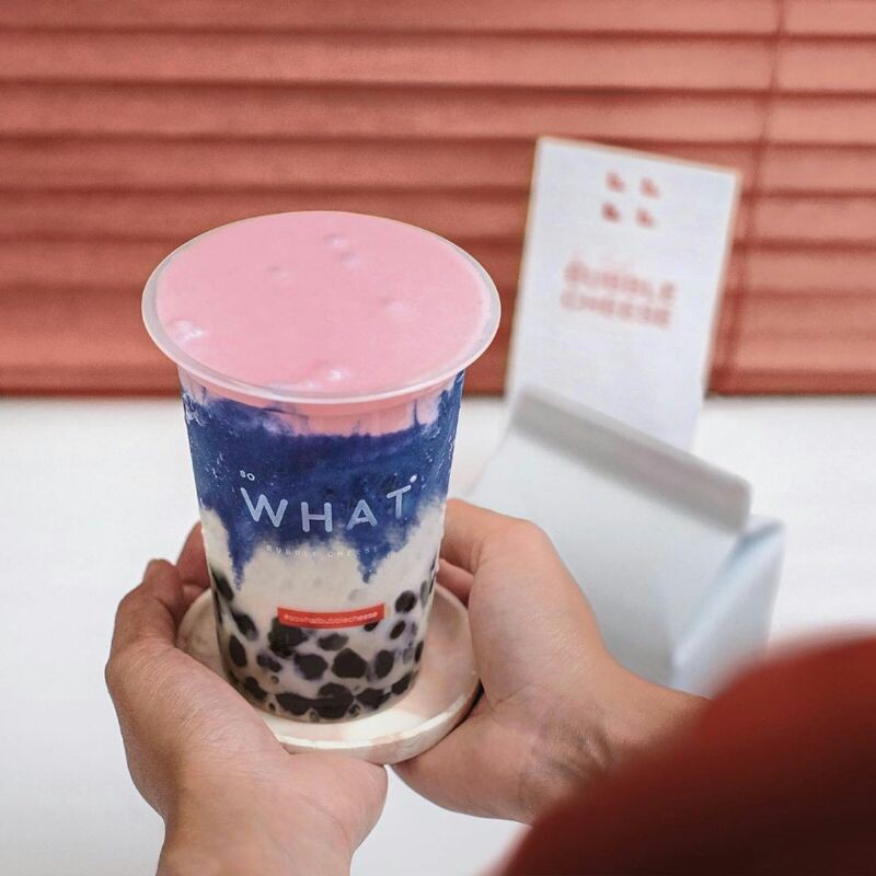 Minuman dingin yang diracik dari bubuk blue vanilla premium dikombinasikan dengan black/golden bobba dan white/pink cream cheese dalam cup 400 ml persembahan SoWhat Bubble, Cheese & Coffee Srengseng Sawah.