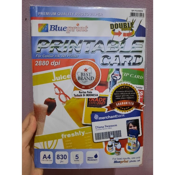 A4 White Printable Card 5 Pcs Blueprint adalag lembaran media cetak (laminating plate) dengan dasar warna putih untuk membuat ID Card dengan 830 mikrometer dan resolusi cetak 2880 dpi dari Blueprint, sehingga Anda dapat membuat ID Card sesuai gambar/tulisan/format bentuk dan ukuran yang dikehendaki dengan bantuan mesin press ID Card (laminating) dan pelubang (punch) ID Card dengan proses cepat