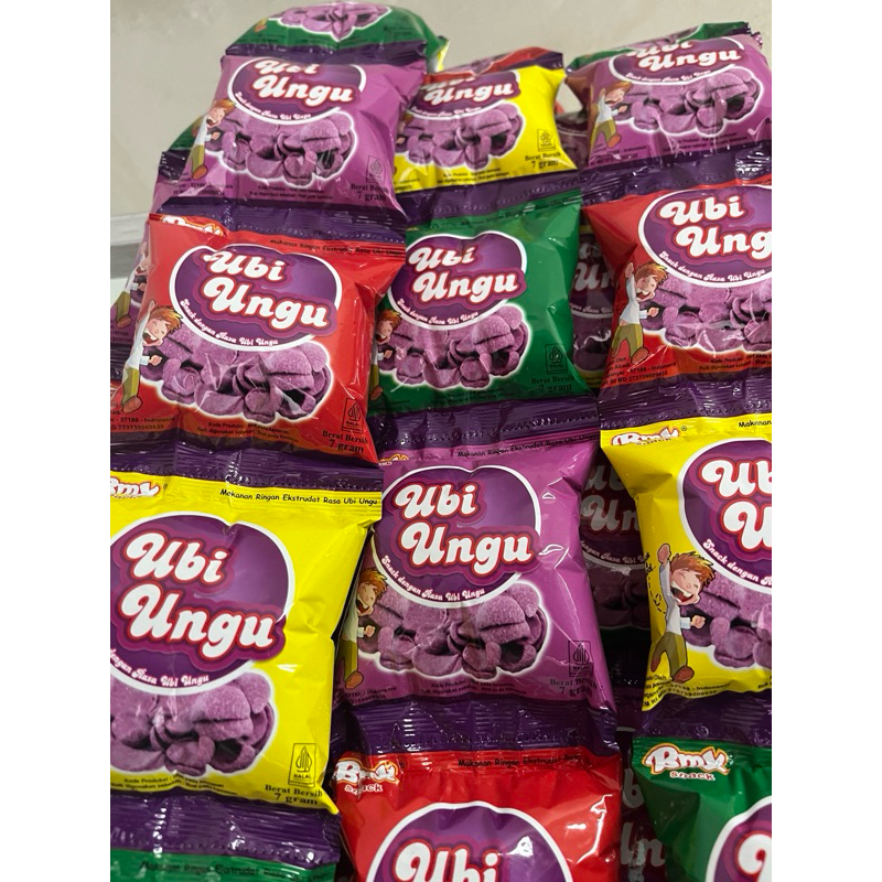 Bmx snack kemasan renceng isi 10 sachet dengan varian rasa ubi ungu, es kopyor, es dawet, dan melon cocok buat teman nyemil.