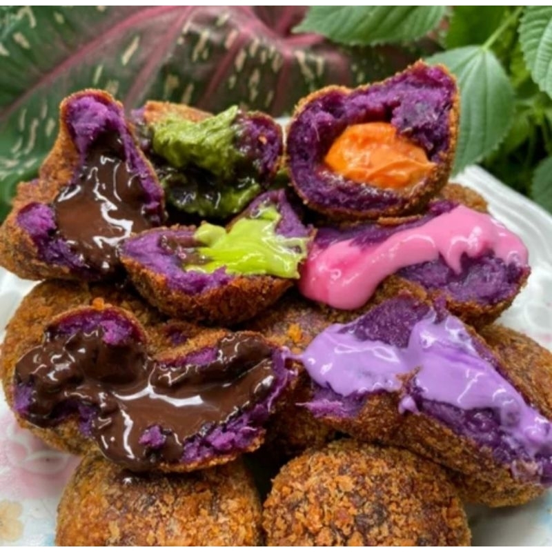 Bola ubi ini berbentuk bola pingpong yang memilliki lelehan keju didalamnya serta diberi topping yang beraneka rasa seperti Cheese, Meises, Oreo dan Greentea.
