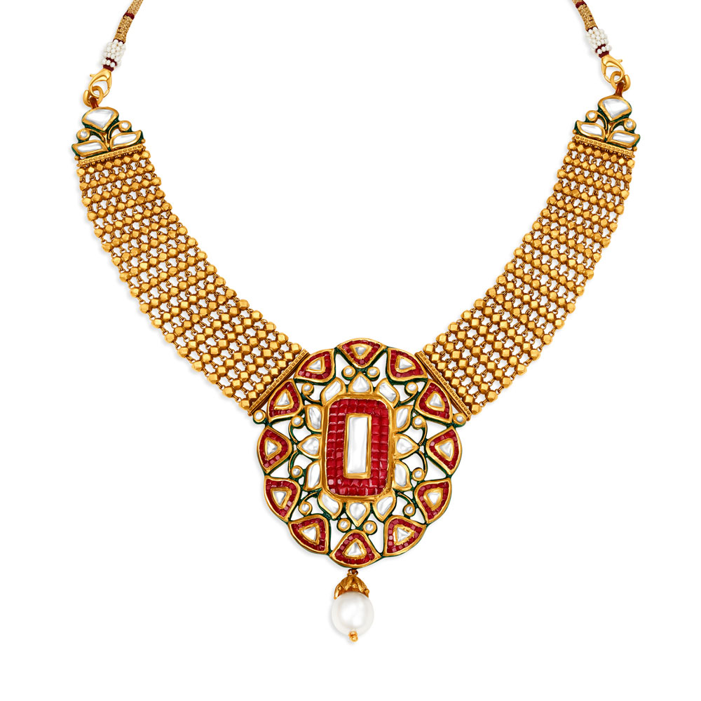 Make a bold statement at your special occasion with this Necklace set crafted in 22 Karat Yellow Gold with coloured detailing. | TANISHQ