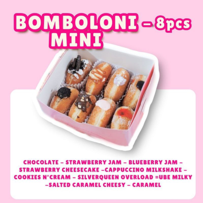 Bomboloni ukuran bite size, variant blueberry jam, strawberry jam, chocolate, Cappucino, caramel, cookies n cream,ube milky, strawberry cheesecake