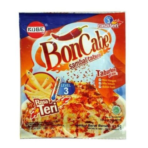 Bon Cabe Sambal tabur dengan perpaduan rasa cabai dan teri. Brand Kobe kemasan Sachet isi bersih 22.5 gr.