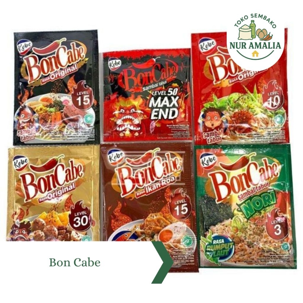 Produk sambal yang hadir dalam bentuk bubuk tabur yang dipersembahkan oleh Kobe. Diolah dari cabe asli yang masih segar dan dikombinasikan dengan cabai rawit untuk menciptakan kombinasi rasa pedas yang menggugah selera. Rasa pedas cabe asli pada BonCabe diimbangi oleh gurihnya rempah-rempah alami sehingga cocok sekali dengan selera orang Indonesia yang suka banget sama makanan pedas. Karena berbentuk kering, sambal tabur BonCabe cocok dengan berbagai makanan, seperti mie ayam, mie instan, bakso, dan lainnya. Tersedia dalam kemasan sachet yang sangat praktis dan mudah sekali dibawa-bawa, sehingga saat Anda pergi kemana saja, tidak perlu lagi kerepotan mencari cabai atau sambal. Rasakan kenikmatan dari rasa pedas yang menggugah selera pada setiap sajian makanan bersama dengan Kobe BonCabe Sambal Tabur.