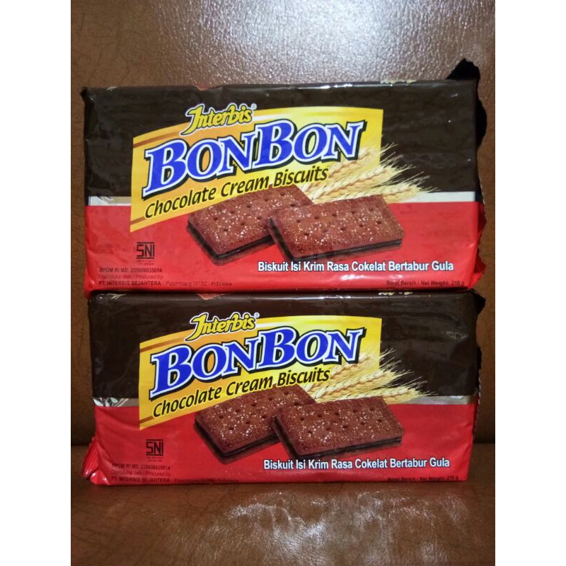 Biskuit BonBon Interbis isi krim rasa cokelat bertabur gula