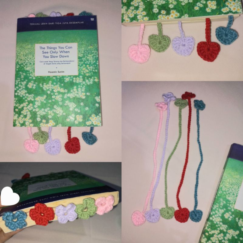 Produk di atas merupakan bookmark rajut yang dibuat 100% handmade dan memiliki banyak variasi yang berbeda, motifnya unik dan menggemaskan. Bookmark ini untuk buku dengan ukuran A5 ya!