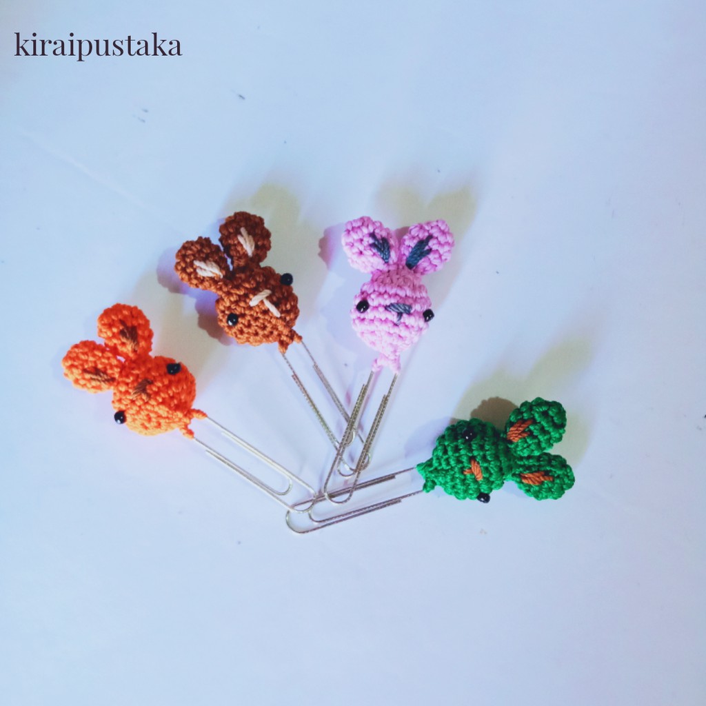 Bookmark atau pembatas buku ini dibuat dari benang yang dirajut dengan rapih sehingga menghasilkan bentuk rajutan yang lucu. Bookmark ini berfungsi sebagai pembatas, penanda halaman buku, sebagai alat yang membantu kita dalam membaca buku. Menentukan halaman mana yang telah kita baca agar kita dapat dengan mudah melanjutkan halaman buku yang akan kita baca.