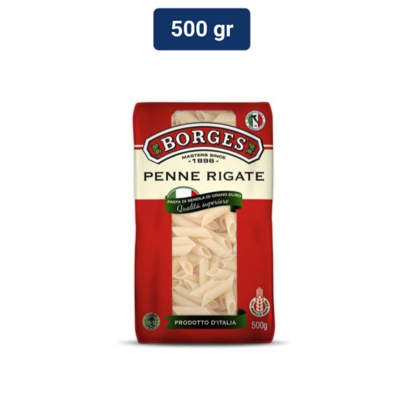 Borges Penne Rigate 500gr adalah pasta yang memiliki bentuk panjang dengan lubang di bagian tengah, sehingga menghasilkan tekstur yang kenyal setelah dimasak. Cocok dimasak dengan paduan saus tomat, saus krim kental, maupun jenis saus pasta lainnya. BPOM: ML 231109194134