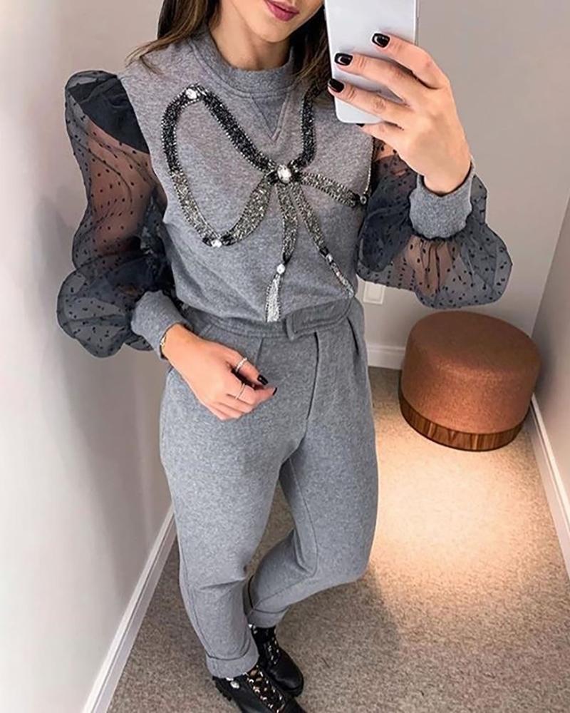 Bowknot Detail Sheer Mesh Top & Pants Set, Dark grey