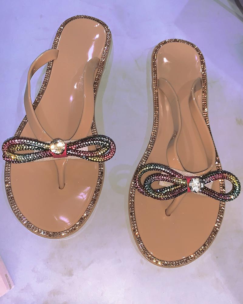Bowknot Pattern Rhinestone Flip Flops, Khaki