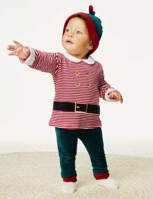 This cotton-rich Christmas elf outfit is perfect for Santa's little helpers. Three-piece set, made in a comfortable regular fit. Includes a striped top with a Peter Pan collar, plus embroidered buttons and a belt. Velvet leggings and a matching hat add a plush feel.