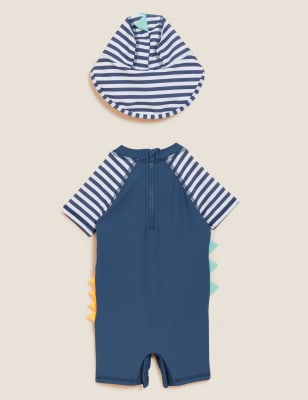 Have some roar-some sunny-day adventures in this cute dinosaur swim set. The all-in-one has short sleeves and legs, with a zip fastening at the back for fuss-free changing. Dino graphics and 2D spike detailing at the sides and on the hat add extra fun. Our clever Sun Smart UPF50+ fabric protects them against harmful UV rays. Plus, it's chlorine-resistant.