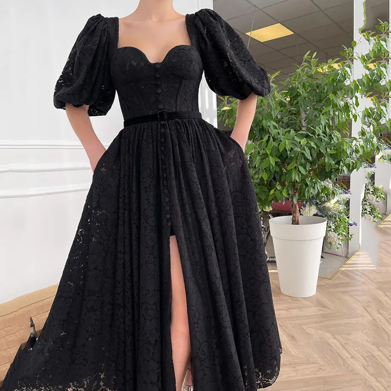BridalAffair, ТРАПЕЦИЕВИДНОЕ черное платье для выпускного вечера с карманами, с пышными рукавами, кружевные вечерние платья, праздничное платье на заказ