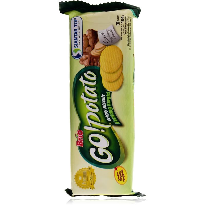 Brio Go! Potato Crispy Biskuit 104g Nikmati renyahnya Brio Go! Potato Crispy Biskuit 104g , biskuit kentang berbentuk kepingan tipis yang renyah. Menikmati waktu santai memang tidak lengkap rasanya tanpa camilan spesial dengan cita rasa yang unik. Untuk memenuhi kebutuhan tersebut, sediakanlah Brio Go! Potato Crispy Biskuit. Biskuit kentang Brio ini memiliki tekstur yang tipis sekaligus renyah di mulut. Terbuat dari bahan kentang pilihan dan proses pembuatannya bukan digoreng melainkan dipanggang, sehingga biskuit Brio Go! Potato lebih sehat dan tetap renyah serta gurih di mulut. Sangat cocok disajikan dalam acara keluarga, camilan sambil minum kopi dipagi hari, maupun menjadi sahabat dalam segala suasana. Cobalah kelezatan berbeda dari biskuit kentang Brio Go! Potato 104g , dan jadikan waktu santaimu menjadi lebih menyenangkan. KOMPOSISI : Tepung terigu, kentang asli, gula, minyak nabati, perisa kentang, susu bubuk, garam, glukosa, pengembang (amonium bikarbonat dan natrium bikarbonat, pengemulsi lesitin kedelai monosodium glutamat, enzim protease, pewarna makanan tartrazine CI 19140.