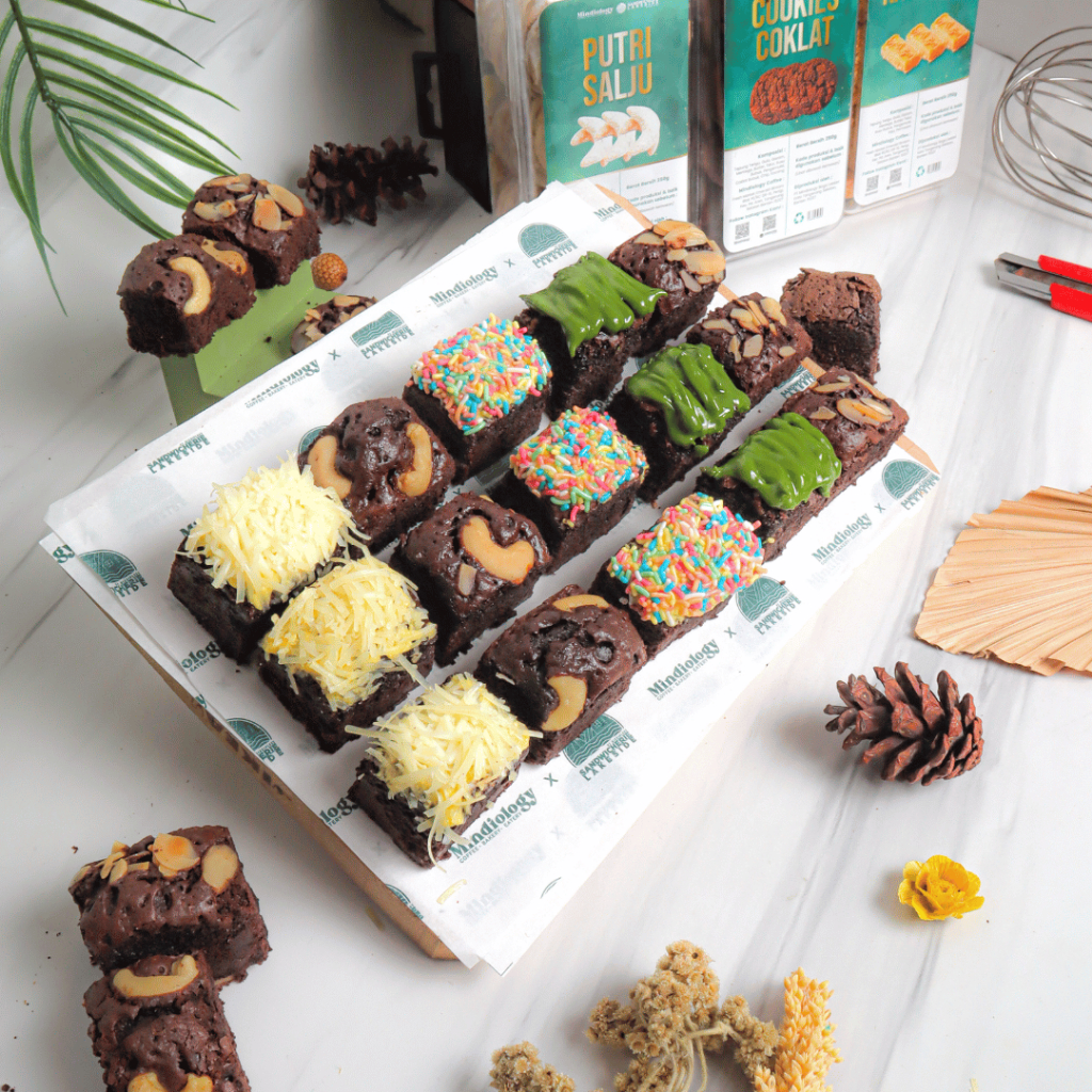 Brownies Multi-Rasa khas Mindiology dengan 4 rasa yaitu Almond, Cheese, Matcha, Meses, dan Mede