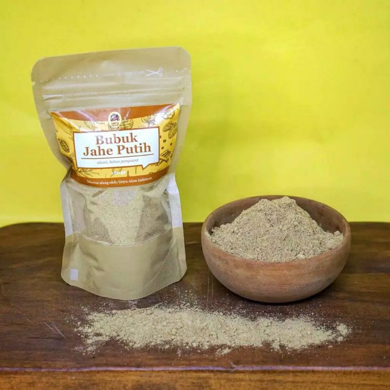 Jahe putih yang dikeringkan kemudian digiling halus dan disaring sehingga menjadi bentuk serbuk. murni, masih mentah belum dicampur bahan lain.