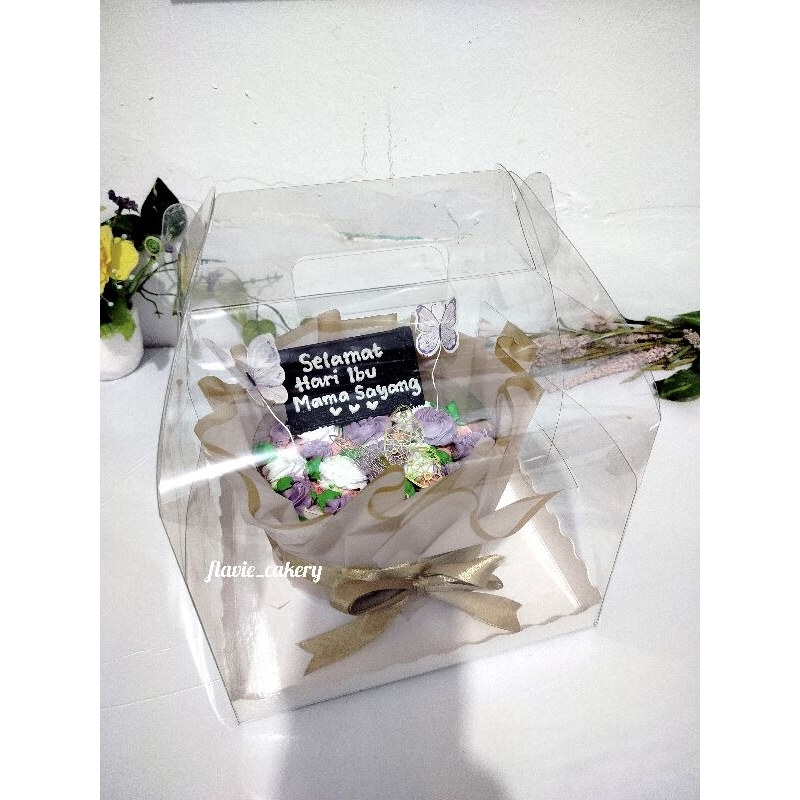 Kue ulang tahun yang dikemas dengan kertas hias menyerupai buket bunga. kue bisa dimakan ya karena sudah dilapisi plastik mika di dalamnya.