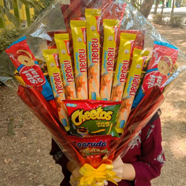 Karangan makanan yang dibuat indah, dirangkai sedemikian lupa sehingga menghasilkan karangan makanan yang terlihat cantik dan sangat cocok untuk diberikan sebagai hadiah untuk orang istimewa. Dengan makanan seperti coklat, wafer, makanan makanan ringan lainnya. Sehingga membentuk buket yang indah, dibalut kembali dengan plastik transparan lalu ditambah hiasan lain seperti pita.