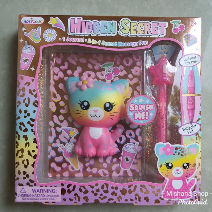 Buku Journal dengan motif Kitty yang lucu dan Squishy dengan pulpen tinta ajaib (Invisible Ink) yang tidak terlihat mata sampai anda gunakan cahaya di pulpen tersebut untuk menimbulkan tulisannya.