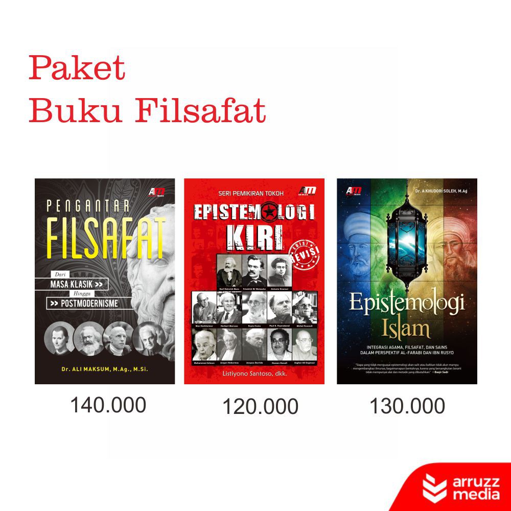 Paket Buku FilsafatPENGANTAR FILSAFAT ; Dari Masa Klasik Hingga PostmodernismePenulis: Ali MaksumPenerbit: Ar-Ruzz MediaTebal: 360 halamanHarga: Rp. 140.000EPISTEMOLOGI ISLAM: Integrasi Agama, Filsafat, dan Sains dalam Perspektif Al-Farabi dan Ibnu RusydPenulis: A. Khudori SolehPenerbit: Ar-Ruzz MediaTebal: 308 halamanHarga: Rp. 130.000EPISTEMOLOGI KIRI Edisi RevisiPenulis: Listiyono Santoso, dkkPenerbit: Ar-Ruzz MediaTebal: 360 halamanHarga: Rp. 120.000