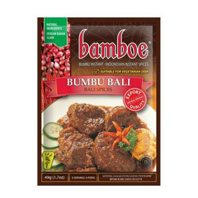 Bamboe Instant Spices is the first ready to cook authentic indonesian recipe, made only from the freshest natural ingredients. Bamboe instant spices is an easy way to prepare indonesia dishes.Bumbu Bali Instant yang terkenal sejak tahun 1968. Bamboe Bumbu bali telah mendapatkan sertifikasi HALAL dari MUI, diproduksi menggunakan pilihan bahan-bahan natural yang fresh dan berkualitas, tanpa tambahan extract, essence, maupun pewarna buatan.