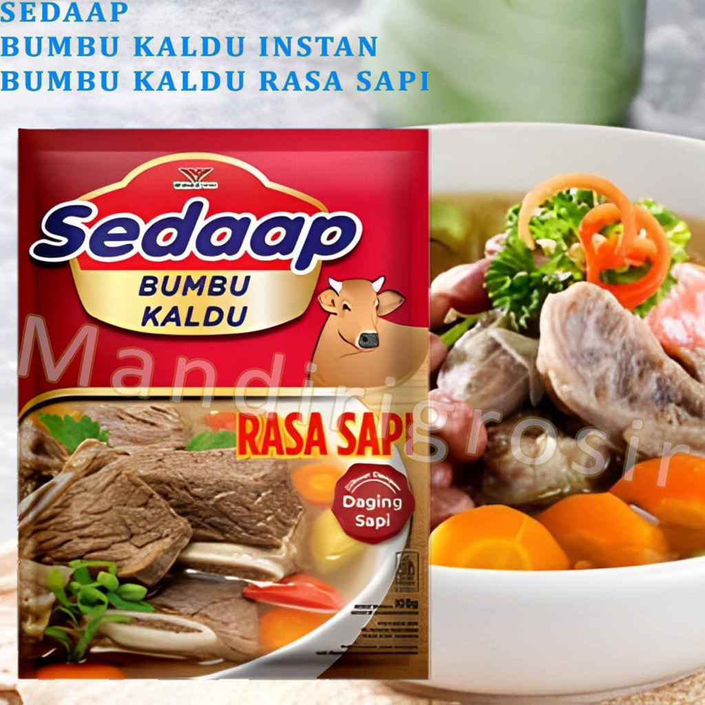 Sedaap bumbu kaldu adalah produk bumbu kaldu instan dari merek Sedaap. Produk ini hadir dalam kemasan 100 gram dan memiliki rasa daging sapi.Bumbu kaldu instan ini dirancang untuk memberikan rasa gurih dan kaya pada berbagai masakan, seperti sup, tumisan, dan hidangan lainnya. Dengan menggunakan bumbu kaldu ini, Anda dapat menambahkan cita rasa daging sapi yang lezat tanpa perlu membuat kaldu dari awal.