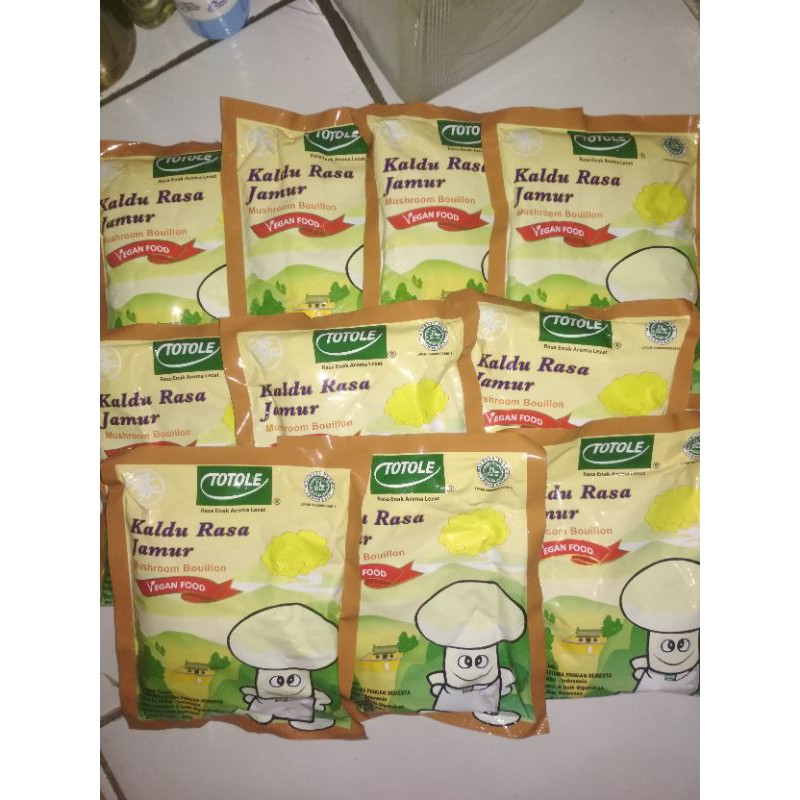 Bumbu masak / kaldu Jamur Totole berbahan baku jamur, sehingga sehat alami tanpa kandungan kimia berbahaya bagi tubuh spt product2 MSG. Bumbu masak Totole berbentuk serbuk sebagai pengganti MSG untuk membuat masakan menjadi lebih lezat dan sehat. Telah terbukti & disukai oleh para Ibu Rumah Tangga & para ahli masak.
