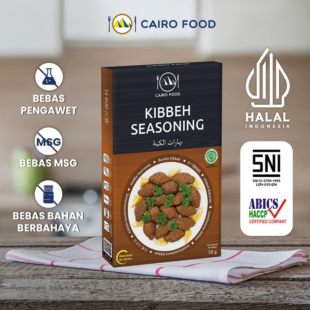Bumbu Kibbeh Non MSG - Cairo FoodKomposisi: Kayu Manis, Lada Hitam, Jahe Putih, Cumin, Biji Ketumbar, Daun Laurel, Cengkeh, Biji Pala, Kapulaga Hijau, Paprika, Kunyit Kuning, Bawang Putih, Caraway, Cabai Merah
