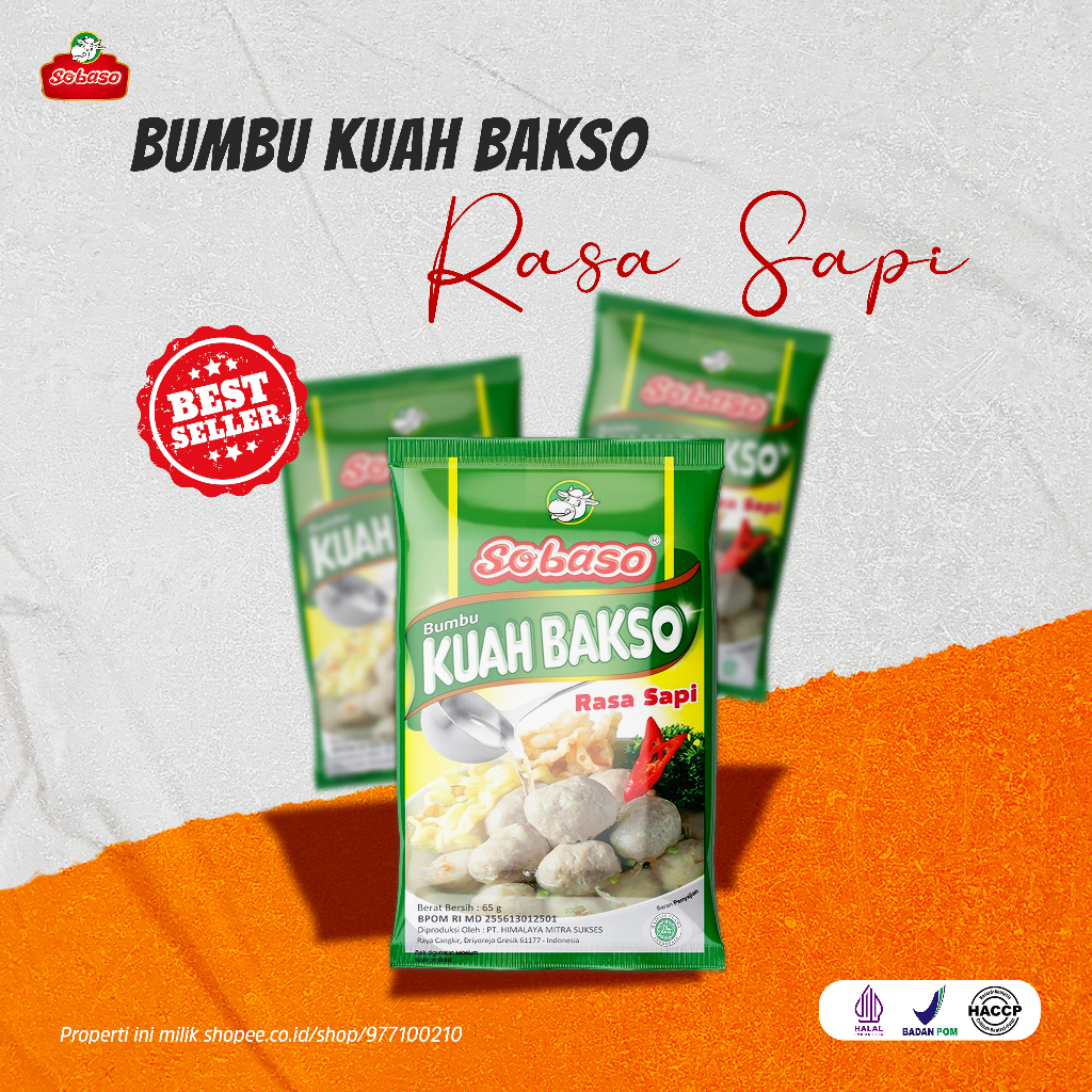 Bumbu kuah Sobaso merupakan bumbu untuk kuah bakso yang menghadirkan rasa sapi pada kuah bakso yang sangat nikmat, dengan rasa yang khas sapi dan tulang sapi. Bumbu kuah Sobaso terbuat dari bahan - bahan yang berkualitas serta terpilih, keunggulan kuah bakso Sobaso adalah instant, praktis, dan harga terjangkau, dengan berat bersih 65 gram.