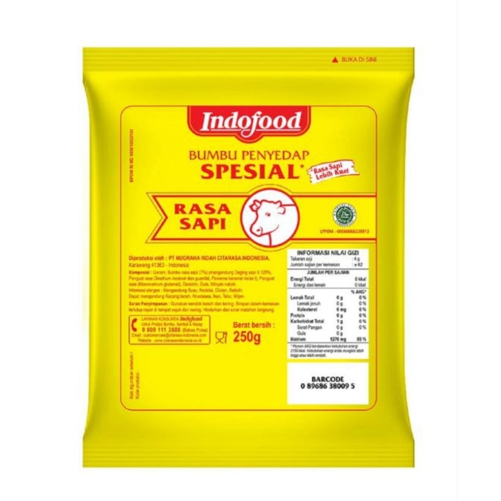 Bumbu Sapi indofood 250gr,isi dalam 1 dus nya adalah 24pcs.Cocok sekali buat Bumbu qndalan Makaroni,bumbu Bakso,Cilok,Seblak,Cuanki dll