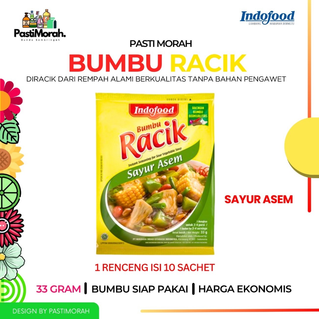 Bumbu RACIK Sayur Asem adalah bumbu siap pakai untuk sayur asem favorit keluarga, jadi masak anti ribet, auto bisa! Bumbu RACIK Sayur Asem memiliki beberapa keunggulan: - Diracik dari rempah alami berkualitas - Tanpa bahan pengawet dan pewarna buatan - Rasa seenak racikan sendiri 1 bungkus Bumbu RACIK Sayur Asem cukup untuk 1x masak untuk 3-4 porsi.