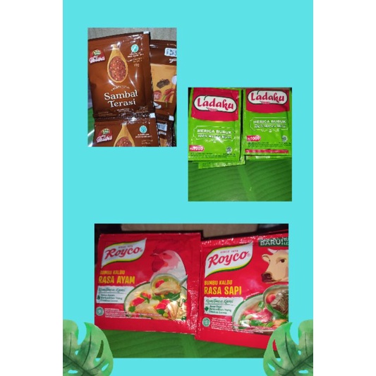 Bumbu Random terdiri dari Royco ayam sachet, Royco sapi sachet, Ladaku merica bubuk, sambel terasi Belibis dan Kecap Indofood Sachet