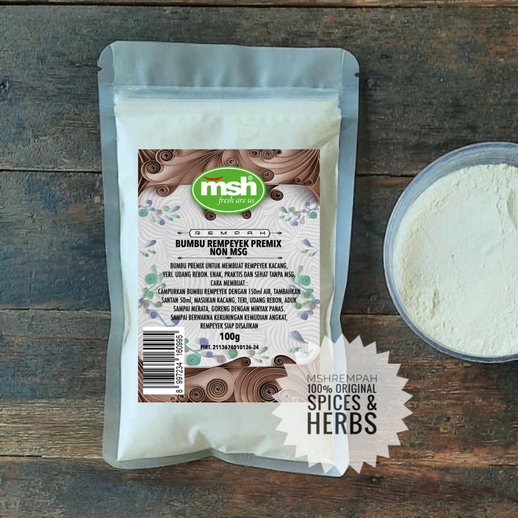 Bumbu rempeyek premix non msg adalah bumbu premix untuk membuat rempeyek kacang, teri, udang rebon. Enak dan sehat tanpa MSG. Hadir dalam kemasan pouch dengan berat bersih 100 gram, dapat untuk membuat 8 rempeyek, praktis dan mudah untuk digunakan.