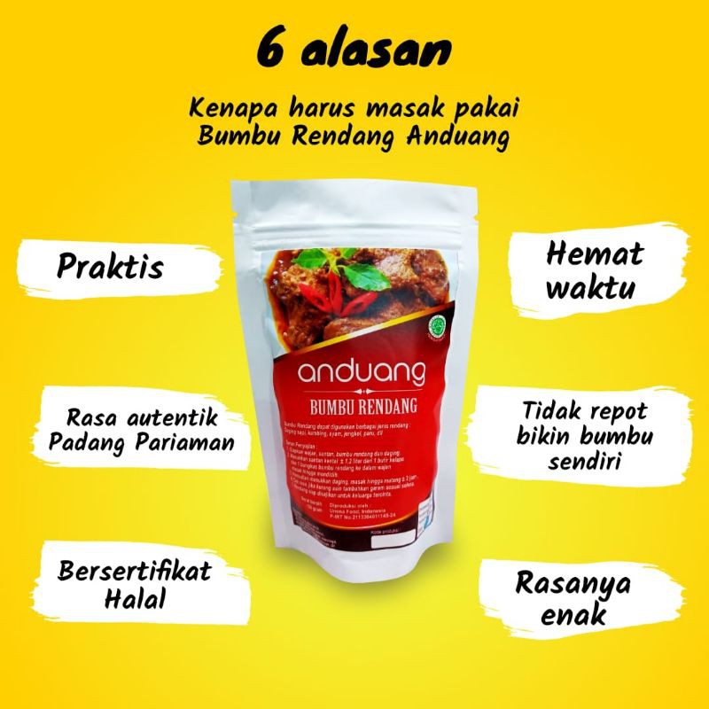 Cobain yuk, Bumbu Rendang Anduang kemasan Premium, cara gampang bikin masakan padang. Tinggal tambahkan santan saja, tanpa harus menambah apa-apa lagi. Hidangan Padang istimewa sudah tersedia di dapur anda.
