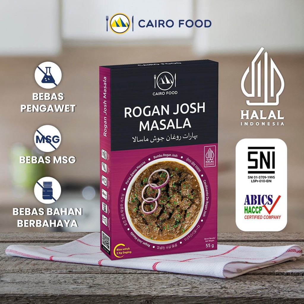 Bumbu Rogan Josh Non MSG - Cairo FoodKomposisi: Cumin, Biji Ketumbar, Cabai Merah, Paprika, Kayu Manis, Lada Hitam, Cengkeh, Daun Laurel, Kapulaga Hijau, Jahe Putih, Kapulaga Putih, Biji Pala, Biji Adas Manis, Kunyit Kuning