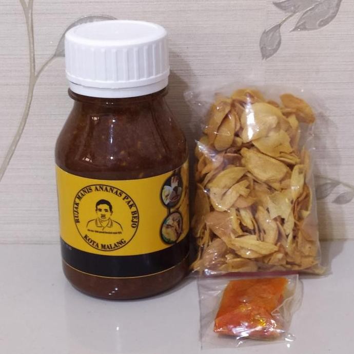 Bumbu rujak manis legendaris di kota Malang, dengan pelengkap bawang putih goreng dan sambal.
