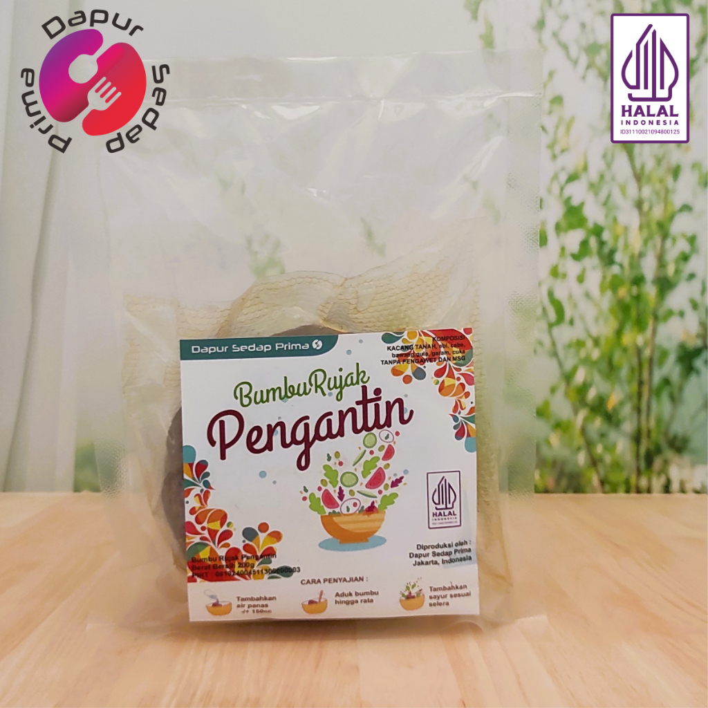 Bumbu Rujak Pengantin yang rasa gurih dan sedap dengan rasa ebi, yang diproduksi secara higenis dengan bahan kacang tanah berkualitas diolah dengan cabai, gula merah , bawang, cuka dan garam, diolah dengan resep yang sedap disajikan dengan sayur-sayuran.
