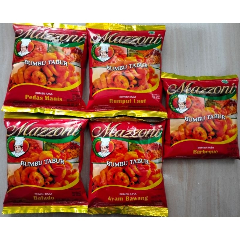 Bumbu Tabur MAZZONI berbagai rasa memiliki aroma khas pedas manis,rumput laut,berbeque,ayam bawang,balado dengan warna cerah alami. Diracik dengan bahan baku pilihan yang berkualitas dan diproduksi dengan higienis menjadikan MAZZONI memiliki rasa yang enak dan menjadi pilihan tepat untuk membumbui camilan seperti keripik, kerupuk, aneka gorengan, dan bakaran. Bumbu Tabur MAZZONI memiliki varian rasa yang lengkap dengan harga yang ekonomis.