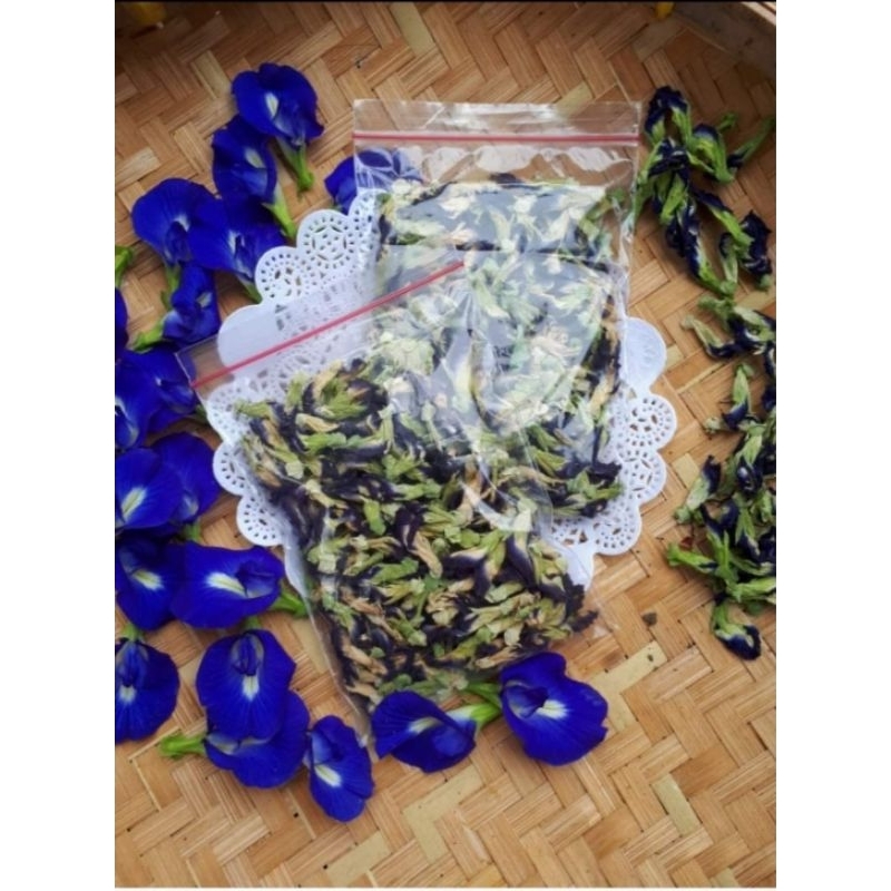Bunga Telang Kering mengandung antioksidan tinggi. Bisa digunakan sebagai teh dan campuran makanan lainnya.