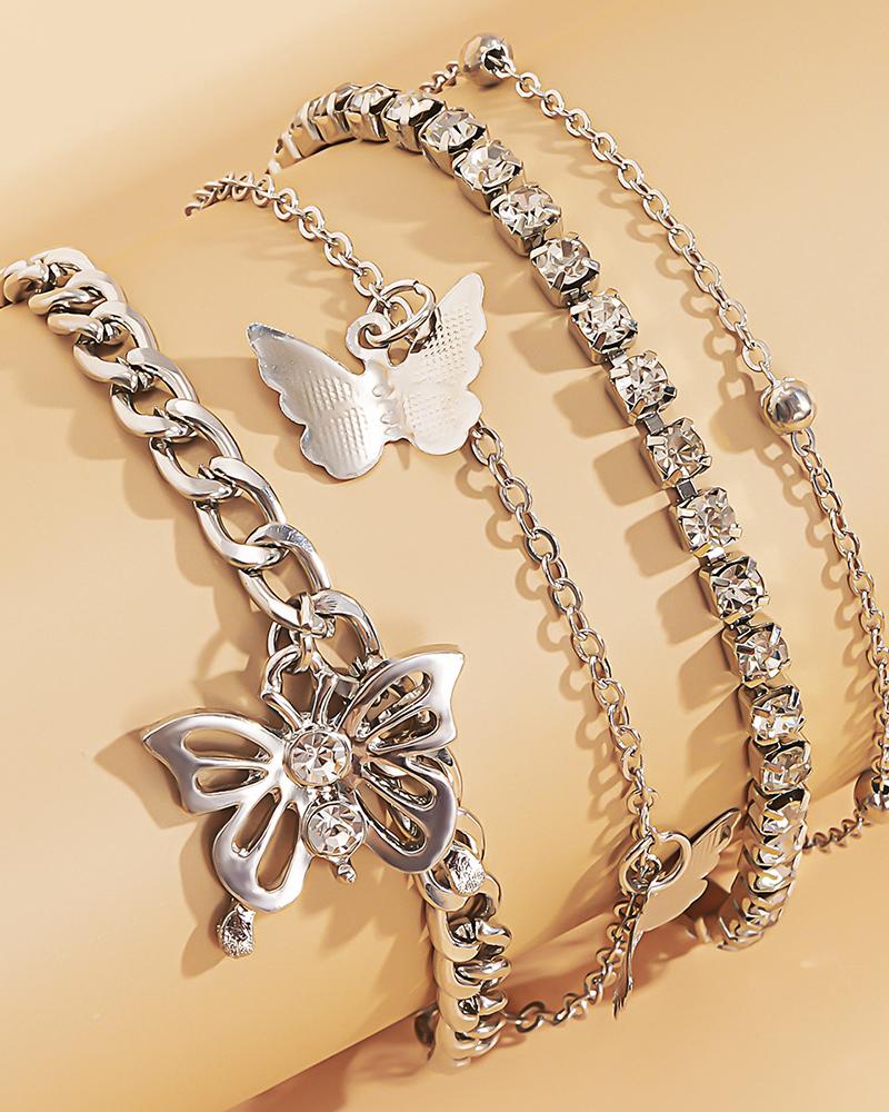 Butterfly Pattern Rhinestone Chain Anklet, Silver