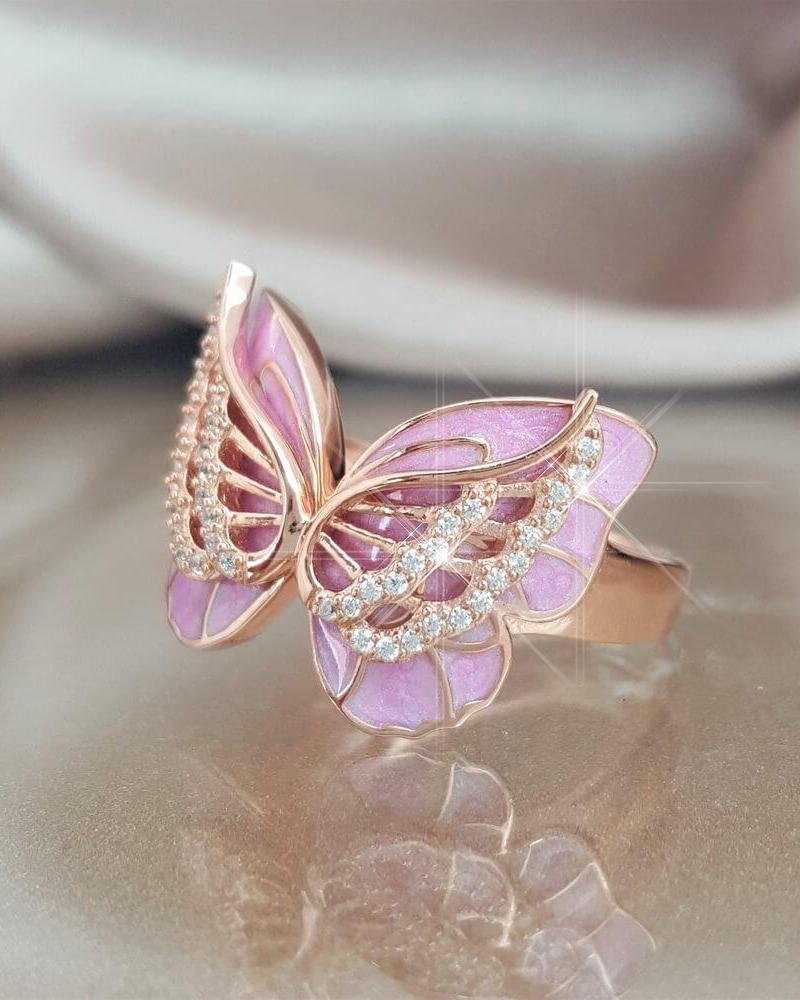 Butterfly Pattern Rhinestone Decor Ring, Pink