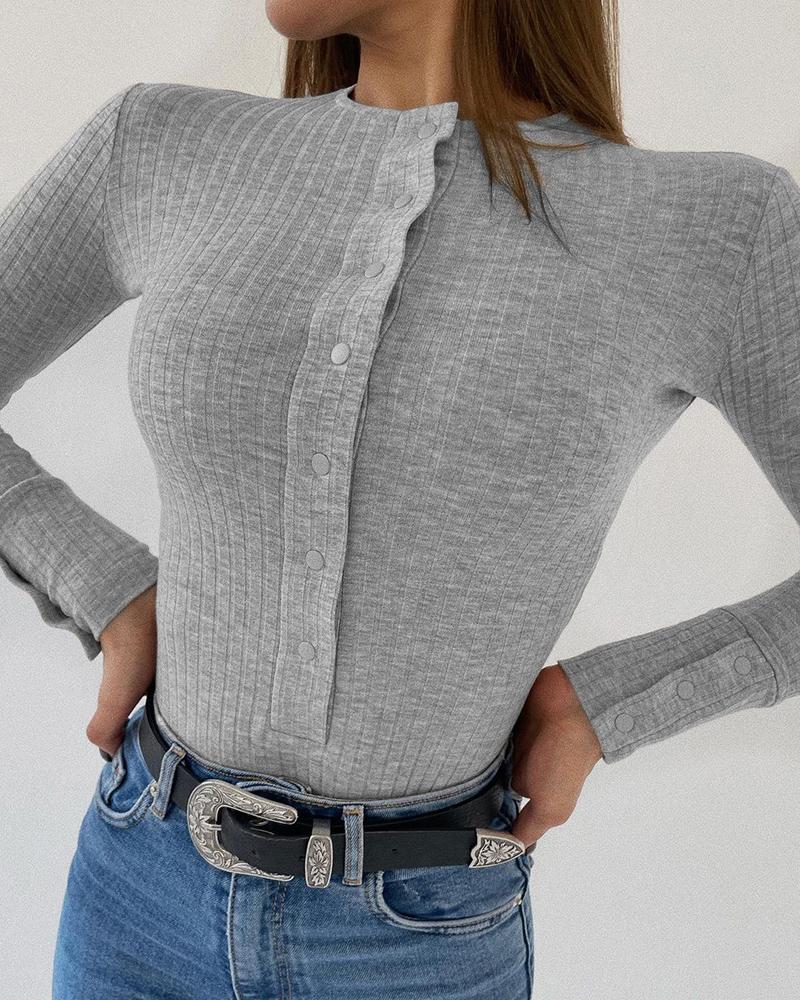 Button Design Long Sleeve Ribbed Bodysuit, Light gray