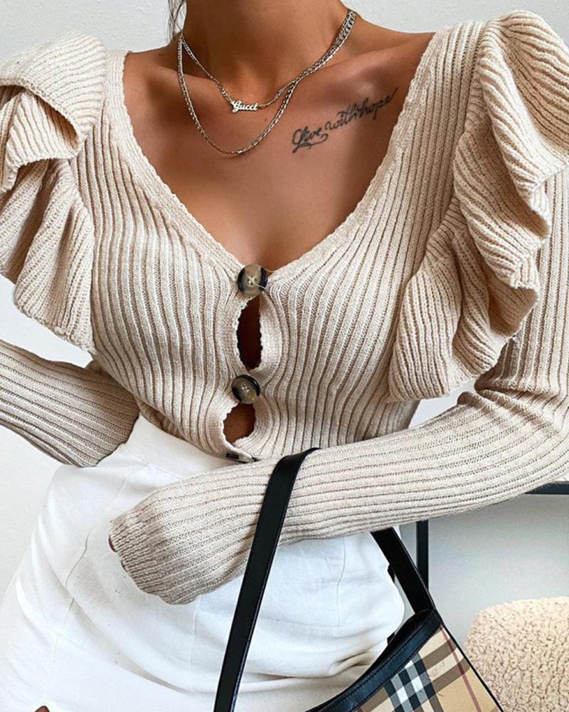 Button Design Ruffles Trim Knit Sweater, Apricot