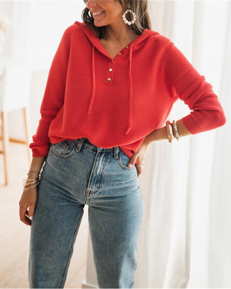 Button Front Drawstring Hooded Sweater, Red