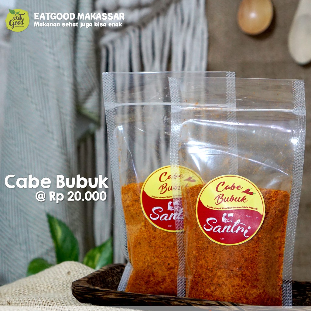 Cabe Bubuk Santri produksi rumahan yang dihasilkan dari cabai kualitas terbaik dan tanpa bahan pengawet.