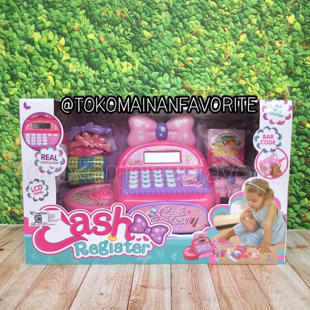 Mainan kasir dengan model pita yang lucu diatas kasir serta adanya beberapa aksesoris sebagai pendukung untuk bermain.