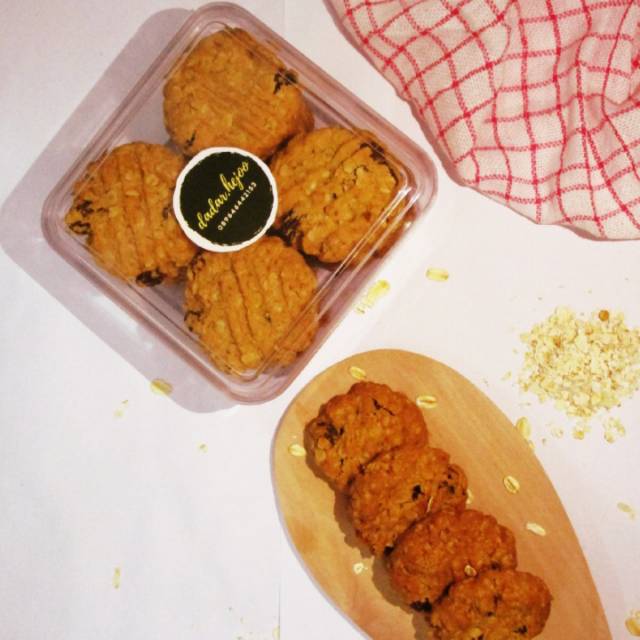 wohooo bayanginn crunchynya oatmeal with raisins dalam satu gigitan yang bisa dijadiin camilan pendamping kopi , susu , teh. cookies ini aman dikonsumsi oleh anak-anak juga loh !